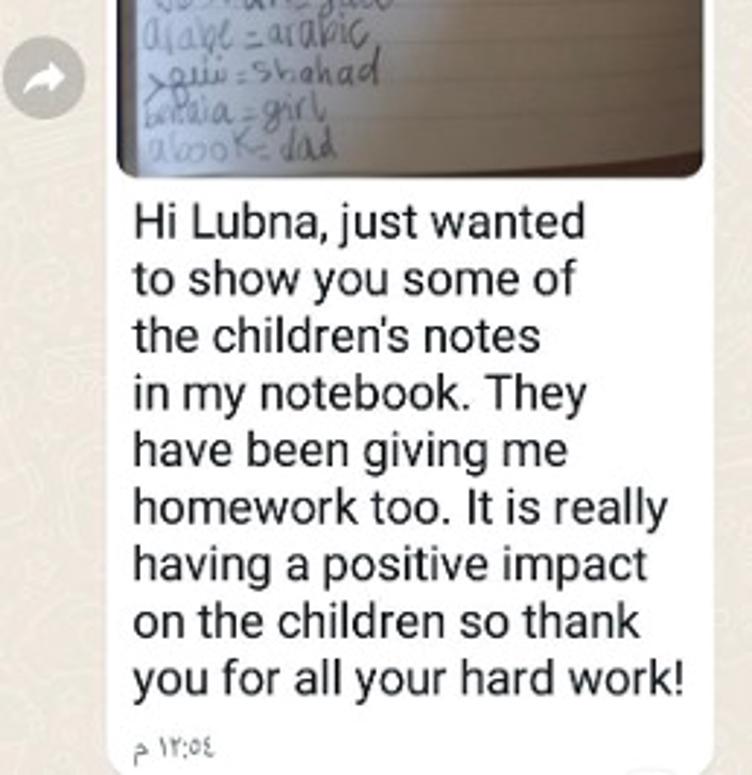 Screenshot from a WhatsApp conversation between an Arabic learning member of staff in Scotland and their Arabic teacher in Gaza (screenshot shared with consent).