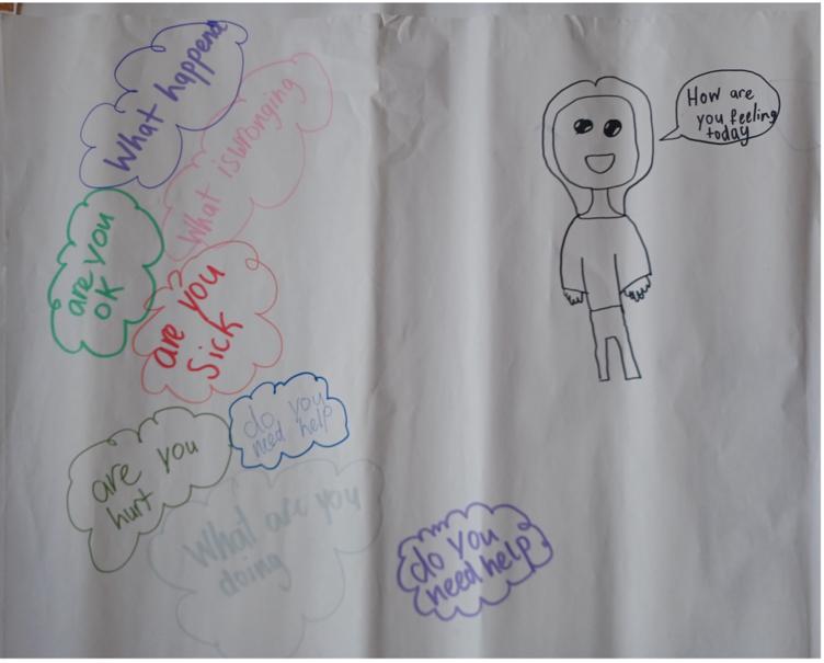 It is important to note that both ‘language for hospitality’ and ‘language for wellbeing’ address the crucial need of establishing interpersonal connections, showing empathy, and ensuring communication in case of illness or distress. This was a need that emerged from all interviews/focus groups carried out at the needs analysis stage. For example, one of the staff told us: “I need to know what to say when children are crying”; and, when asked what staff in their school should learn to say in Arabic, a group of Arabic speaking pupils designed this poster: