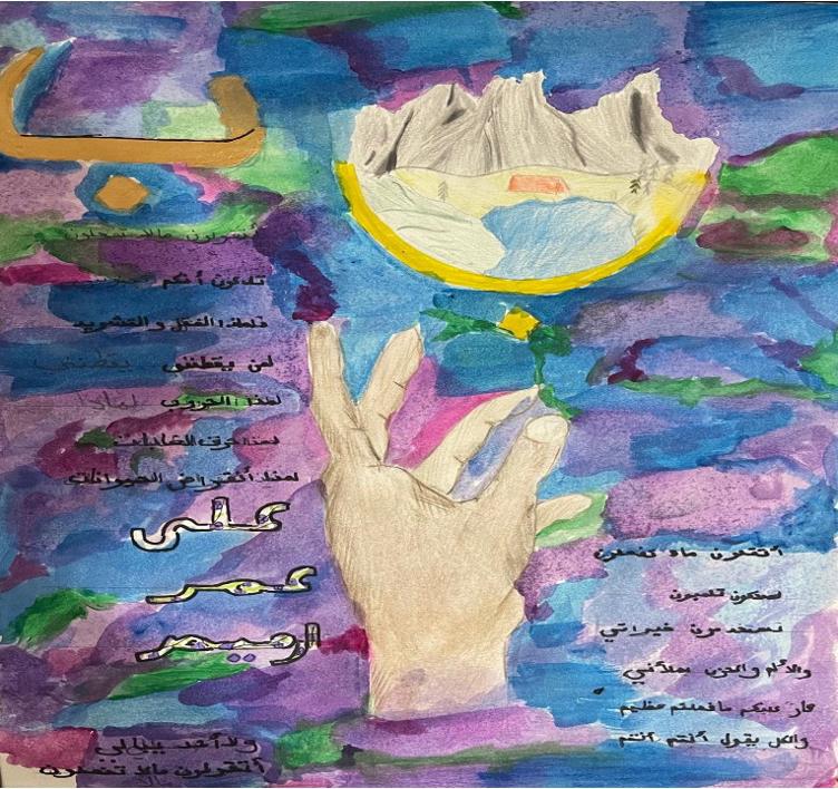 Yusra’s final project, titled “كوكبنا بين يديك” (Our planet in your hands). Combining modes of art and poetic text, the work is fascinating, expressive and highly symbolic.