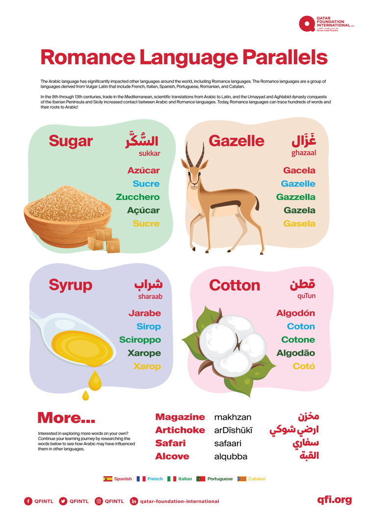The Arabic language has significantly impacted other languages around the world, including Romance languages. The Romance languages are a group of languages derived from Vulgar Latin that include French, Italian, Spanish, Portuguese, Romanian, and Catalan.