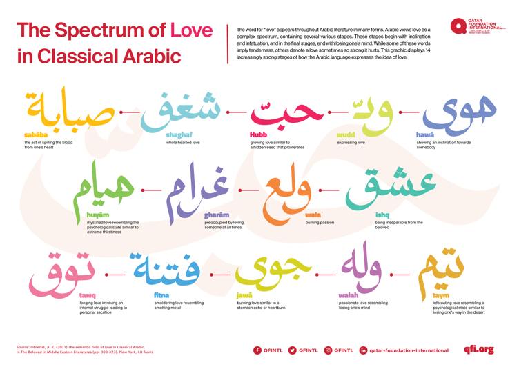 The word for “love” appears throughout Arabic literature in many forms. Arabic views love as a complex spectrum, containing several various stages. These stages begin with inclination and infatuation, and in the final stages, end with losing one’s mind. While some of these words imply tenderness, others denote a love sometimes so strong it hurts. This graphic displays 14 increasingly strong stages of how the Arabic language expresses the idea of love.